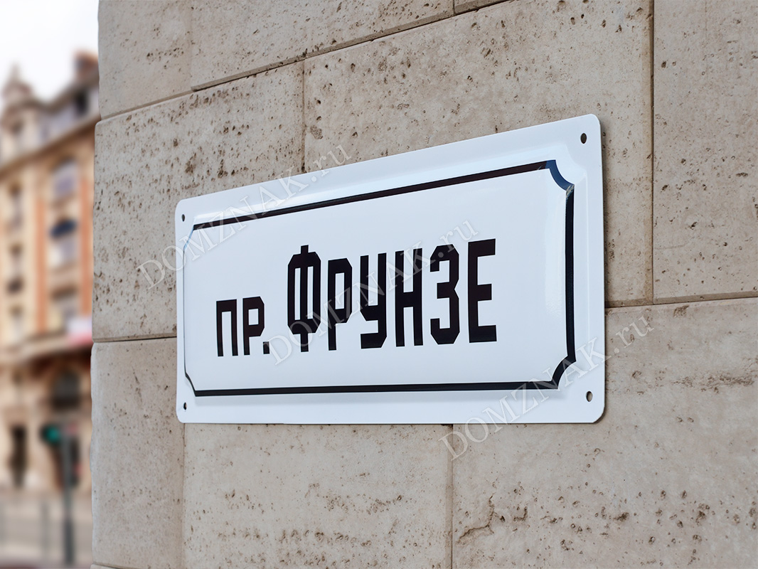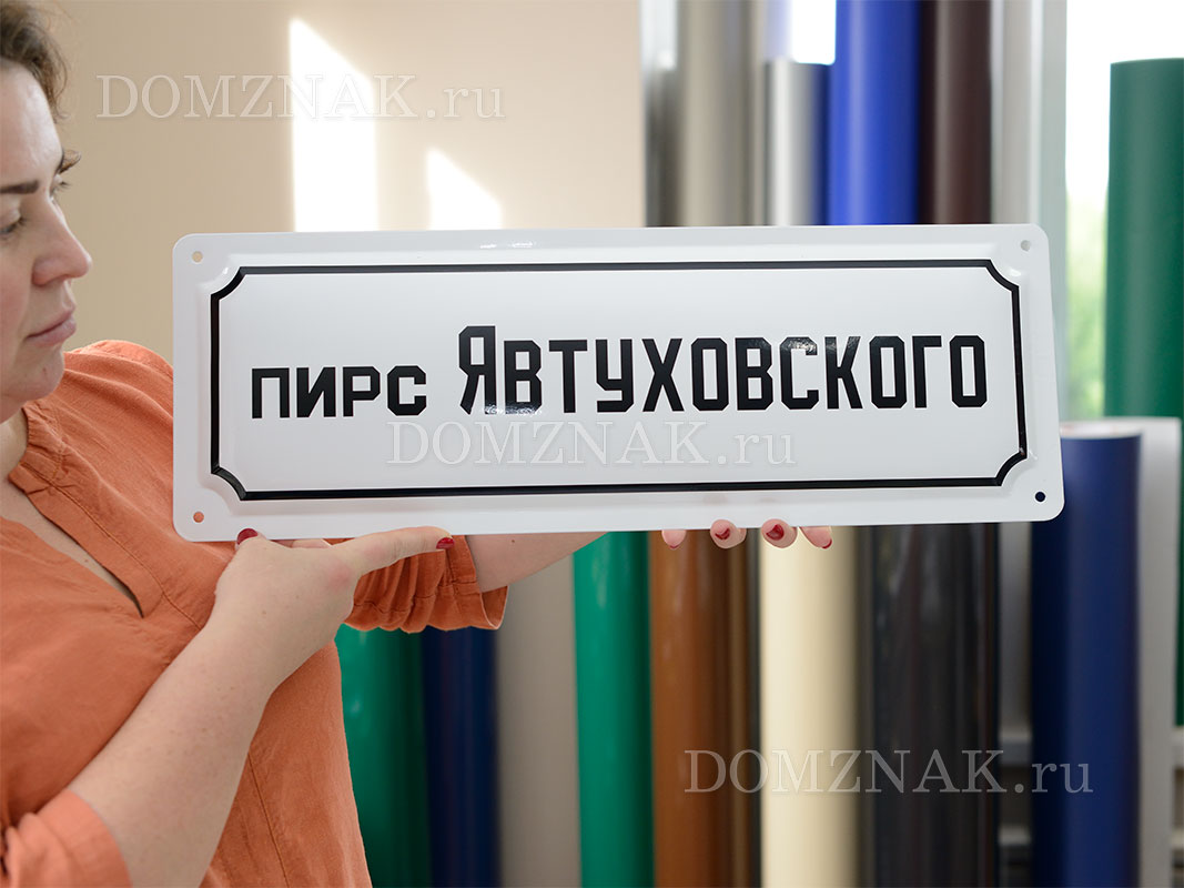 Выпуклая основа таблички изготавливается (выштамповывается) из оцинкованного металла (толщиной 0,7 мм) и окрашивается стойкой порошковой эмалью. Надписи наносятся по технологии аппликации, качественными пленками немецкого производства. Срок службы таблички – не менее 7 лет.
