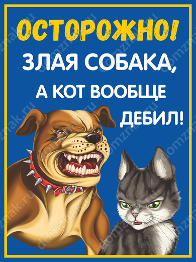 Прикольная табличка «Собака злая, кот дебил» изготавливается на основе из пластика ПВХ или оцинкованного металла.