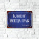 Табличка «Клиент всегда прав, пока трезв.» изготовлена из пластика ПВХ, толщиной 4 мм. Изображение наносится по технологии УФ-печати. Табличка предназначена для использования как в помещении, так и на улице.