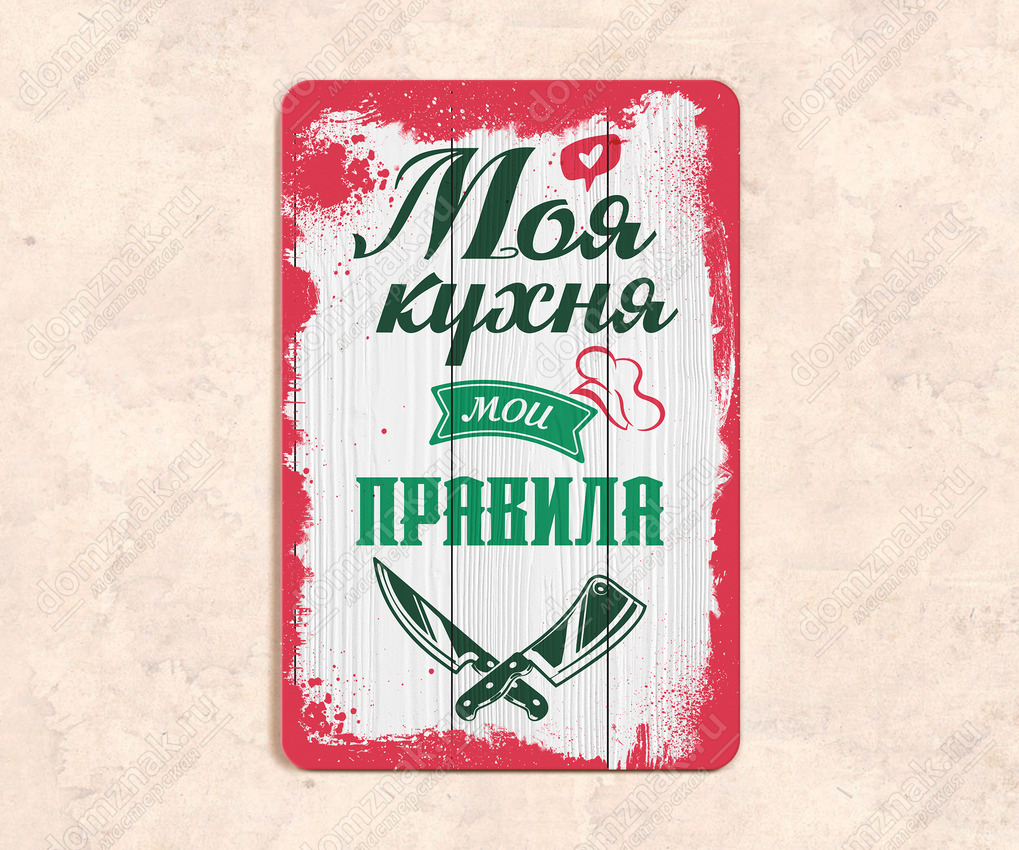 Табличка «Моя кухня, мои правила» изготовлена из пластика ПВХ, толщиной 4 мм. Изображение наносится по технологии УФ-печати. Табличка предназначена для использования как в помещении, так и на улице.
