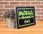 Табличку «Выход» можно обыграть по-разному. Для игровых клубов, центров квестов и приключений, кинотеатров и других общественных мест, где выбирают нестандартные решения в концепции и интерьере, мы разработали необычную табличку «Выход в реальность», которая покажет, где находится дверь в реальный мир. Черный фон, зеленые буквы, своеобразное оформление – декоративная табличка подчеркнет стиль заведения и его развлекательный статус.