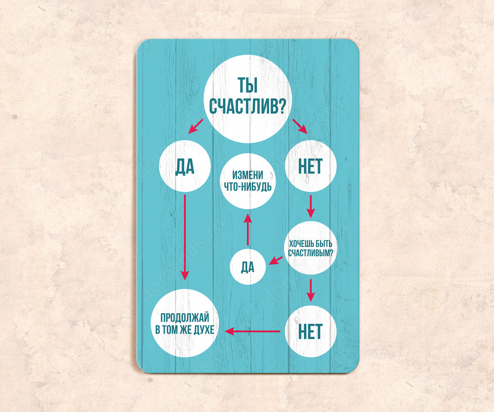 Табличка «Ты счастлив?» изготовлена из пластика ПВХ, толщиной 4 мм. Изображение наносится по технологии УФ-печати. Табличка предназначена для использования как в помещении, так и на улице.