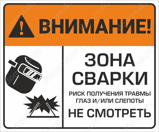 Табличка «Внимание! Зона сварки не смотреть.» изготавливается на основе из пластика ПВХ или оцинкованного металла.