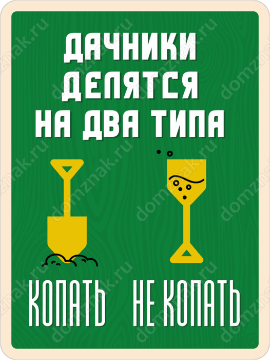 Табличка «Дачники деляться на вида типа: копать, не копать.» изготовлена из пластика ПВХ, толщиной 4 мм. Изображение наносится по технологии УФ-печати. Табличка предназначена для использования как в помещении, так и на улице.
