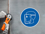 Предписывающий знак безопасности «Работать в защитном щитке» (код M08), используется на рабочих местах и участках, где необходима защита лица и органов зрения.